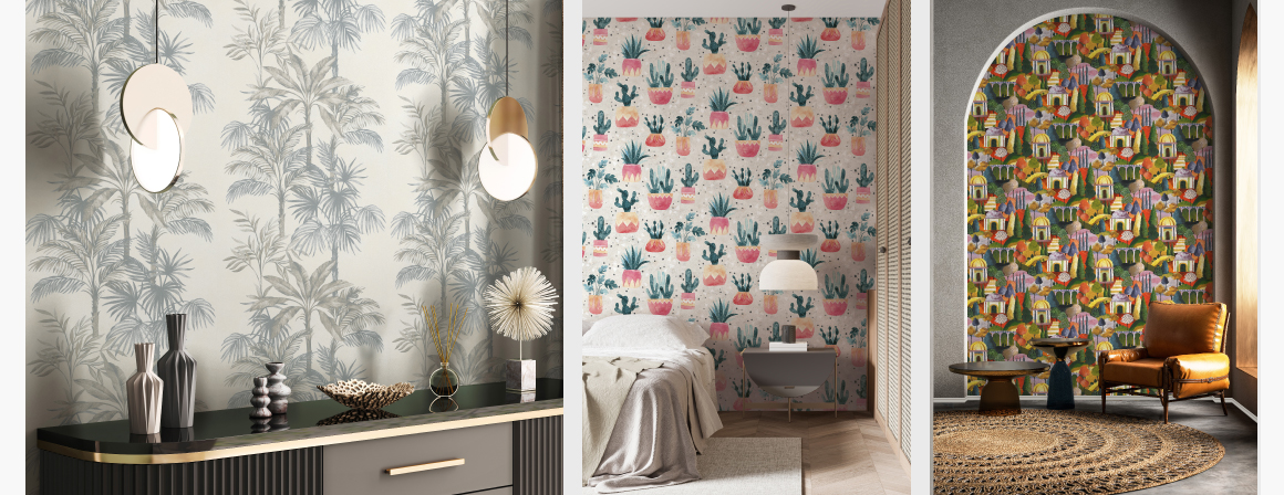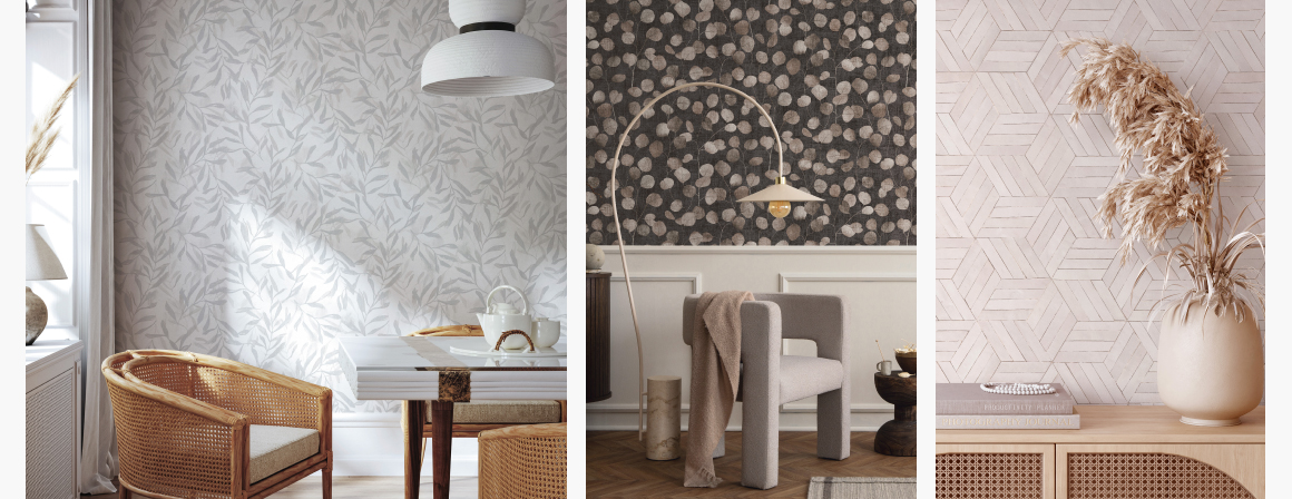 Experience the gentle touch of nature in a contemporary design. Inspired by the serene landscapes of Santorini and the vibrant coastal spirit of Miami, the Novamur Leyla Collection blends natural elegance with contemporary design. From delicate textile-like leaf motifs, traditional Viennese cane weave, and modern leaf designs, to minimalist plaster textures, Mediterranean landscapes, and artistic statement pieces. Rendered in soft neutrals and light pastels, the wallpapers bring vibrancy without being overwhelming, creating a calm, relaxing atmosphere with subtle elegance.