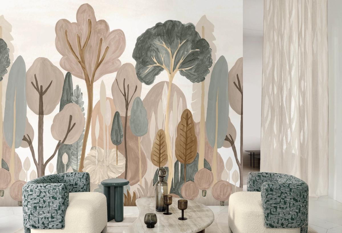 The designs feature clean yet powerful lines, mysterious and intriguing color palettes, and elements that evoke depth and allure. These qualities transform walls and spaces into something profoundly enchanting. Overall, Panorama 3 creates a luxurious atmosphere that is neither rigid nor overwhelming. It strikes a perfect balance between gentleness and strength, setting it apart from typical nature-inspired wallpapers.