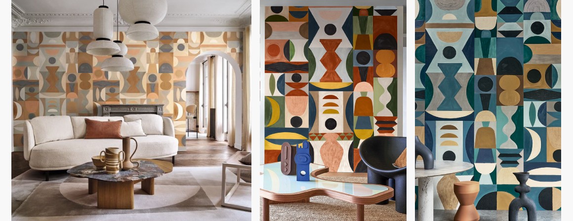 ผืนผ้าใบบนผนังจากสตูดิโอวาดภาพของศิลปิน สไตล์ของลวดลายในคอลเลคชั่นนี้ มีทั้งลายที่ใช้เทคนิค Poster paintbrush เป็นรูปทรงเรขาคณิตขนาดใหญ่ ลายผ้าปัก embroidery จัดวางองค์ประกอบซ้อนทับกัน เป็นคอลเลคชั่นที่เติมเต็มไปด้วยงานศิลปะ