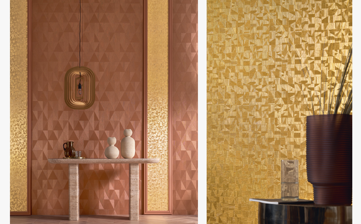 ได้รับแรงบันดาลใจจากศิลปะการเจียระไนอัญมณีอันประณีต โดยนำจุดเด่นของความสว่าง การสะท้อนแสงของวัสดุมาใช้เป็นลูกเล่นบนลายวอลเปเปอร์ เอกลักษณ์ของลายถูกออกแบบให้มีมิติจากรูปทรงเรขาคณิต, การเคลื่อนไหวของเส้นสายที่สง่างาม, และพื้นผิวสัมผัส สร้าง Pattern ให้มีมิติและผสมความ Luxury ลงไป ด้วยการใช้แสงและเงาจากการพิมพ์ทับสีเมทัลลิกพร้อมไฮไลท์สีรุ้ง