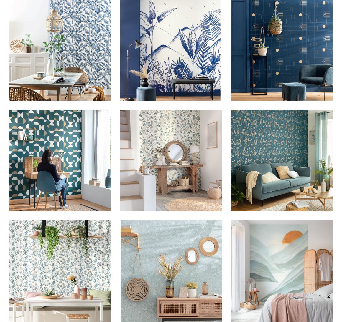 โดยได้แรงบันดาลใจจากสีน้ำเงินในเฉดต่างๆ ที่อยู่รอบตัว เช่นสีฟ้าของท้องฟ้า สีครามของน้ำทะเล และสีน้ำเงินเข้มที่ป็นเทรนด์สีประจำปี มีดีไซน์ให้เลือกถึง 14 ลายยอดนิยม ลายต้นไม้, ใบไม้ สไตล์ทรอปิคอล กราฟฟิกลายสัตว์ ลายดอกไม้ และลายเรขาคณิต และวอลเปเปอร์สีพื้นลายเรียบที่เข้าชุดกัน พร้อมเพิ่มความพิเศษด้วย วอลเปเปอร์ภาพเซ็ตขนาดใหญ่ที่ออกแบบโดย Estelle สไตล์ลิสชื่อดัง