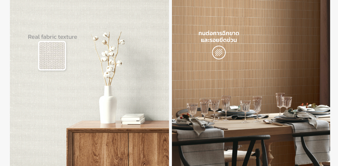 หลากหลายด้วยวอลเปเปอร์สีพื้น เทรนด์สีสมัยใหม่ และ วอลเปเปอร์ลายแพทเทิร์น วอลเปเปอร์พื้นผิวตัวเลือกสำหรับการออกแบบที่หลากหลาย เช่น วอลล์เปเปอร์สีพื้นเท็กซ์เจอร์ผ้าลินิน ที่ให้ผิวสัมผัสละเอียดคล้ายผ้าจริง มีความหนา ทนต่อรอยขีดข่วน พร้อมรองรับได้หลากหลายสไตล์การออกแบบตั้งแต่มินิมอล เรียบหรู ไปจนถึงสไตล์วินเทจ