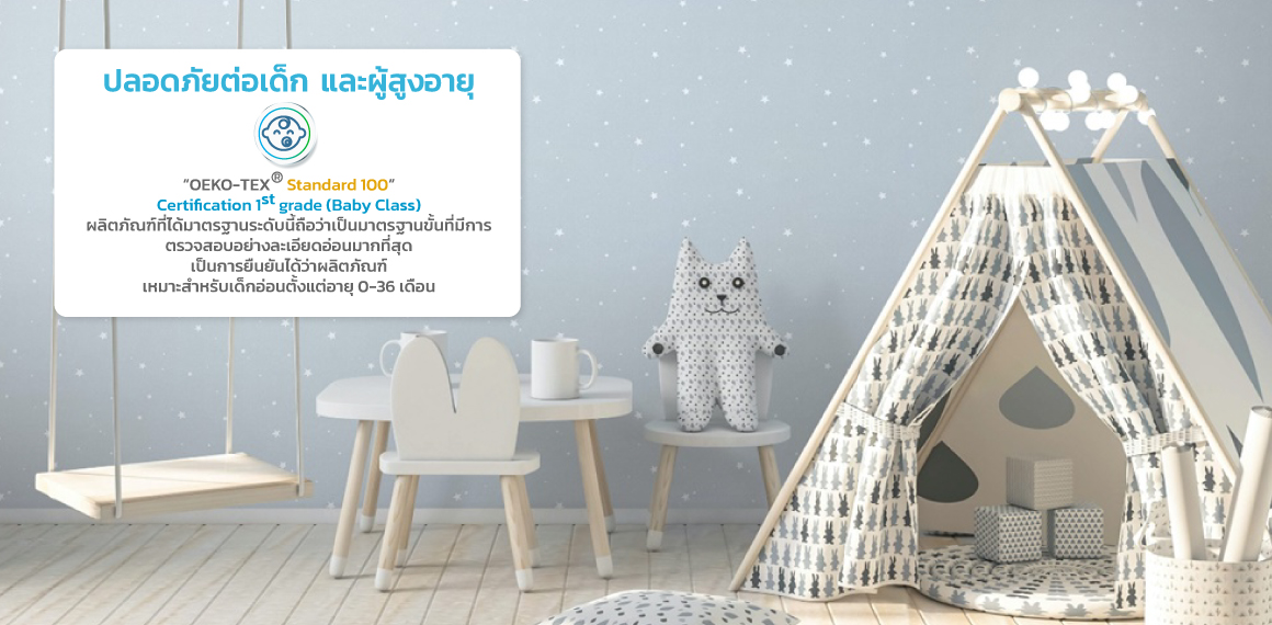 ได้รับการรับรองคุณภาพผลิตภัณฑ์สิ่งทอของยุโรป “OEKO-TEX® Standard 100” Certification 1st grade (Baby Class)