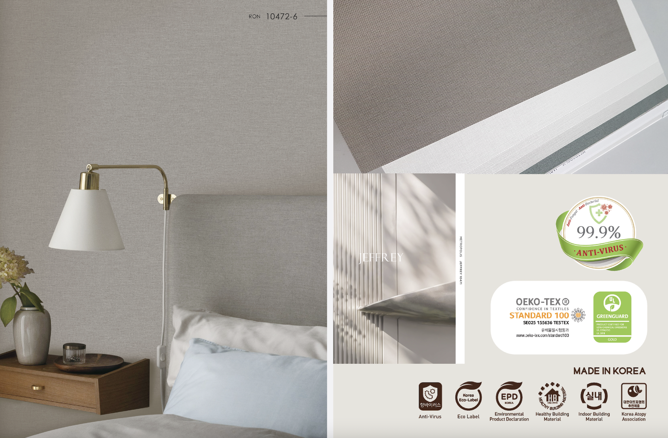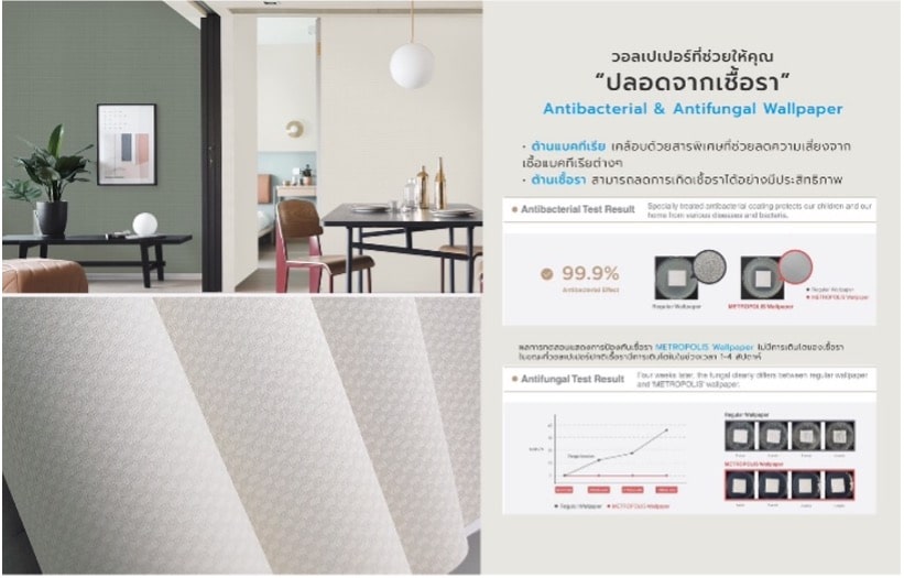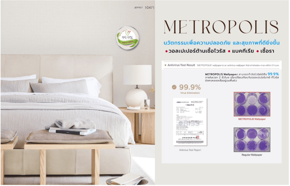 วอลเปเปอร์เพื่อสุขภาพอันดับต้นๆ ที่ได้รับความนิยมอย่างมาก คือคอลเลคชัน Metropolis จากเกาหลี นำเสนอความเรียบหรูในแบบ มินิมอล ด้วยโทนสี เอิร์ธโทน ที่ให้ความรู้สึกอบอุ่น สบายตา เหมาะกับทุกสไตล์ของการแต่งบ้านยุคใหม่ผ่านการทดสอบคุณสมบัติด้านการยับยั้งการสะสมของเชื้อรา และกำจัดไวรัสได้ถึง 99%