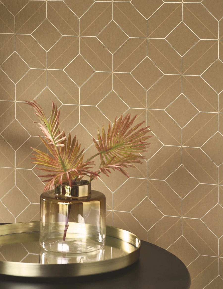 วอลเปเปอร์แบรนด์ Casadeco สไตล์ผสมผสานระหว่าง Modern Elegance และ Art Deco ลวดลายออกแบบที่แสดงถึงความเรียบหรู วอลเปเปอร์ลายเรขาคณิต เส้นสายที่เรียบง่าย ลายเส้นโค้งเว้า ใช้รูปทรงเรขาคณิตมาทับซ้อนให้มีมิติ โทนสีหลักสีน้ำตาล พื้นผิวสะท้อนความงามแบบร่วมสมัย เช่น สีแดง สีเงิน สีเขียว ลายเส้นเมทัลลิกสีทอง สีเบจ เข้ามาเสริมความสวยหรู
